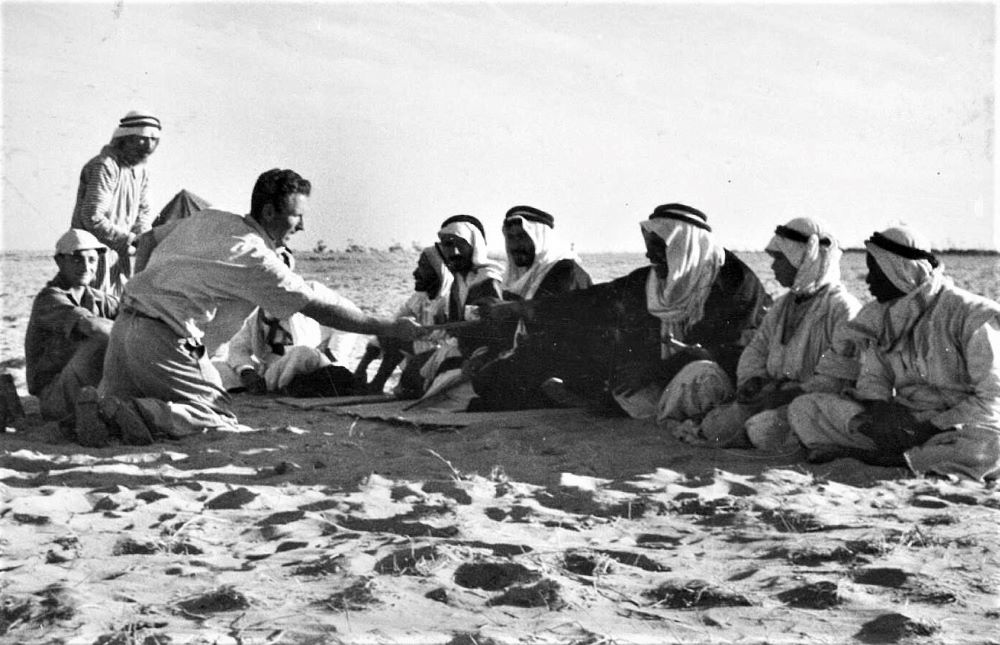 חברי קיבוץ נירים מברכים את השכנים הבדווים לאחר הקמת הקיבוץ במבצע "11 הנקודות", 1946.