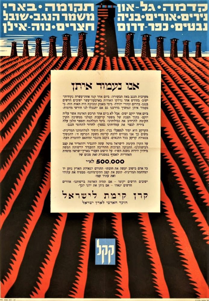 "אנו נעמוד איתן" כרזה מטעם קרן קימת לישראל בעקבות השלמת המבצע להקמת 11 נקודות היישוב בנגב ב-1946, הקוראת להמשיך ולתרום להקמת יישובים נוספים: "התורם לגאולת הארץ נותן יד למלחמה המדינית, קובע את קצב התקדמותנו, מבטיח את עתידו ואת עתיד עמו." (KRA\16)