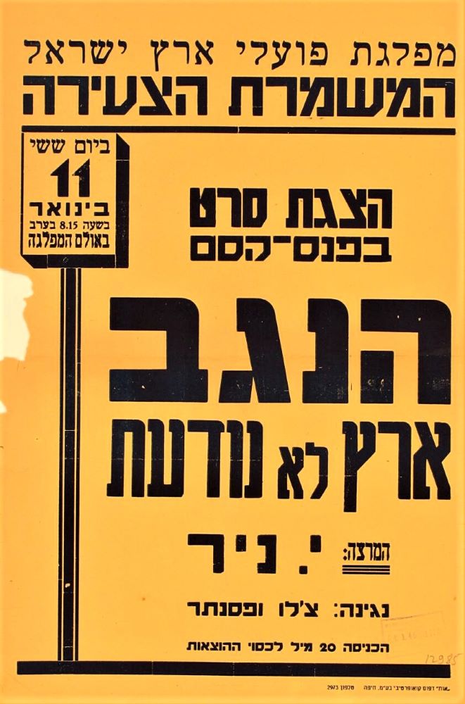 כרוז, המודיע על הצגת הסרט "ארץ לא נודעת" על ההתיישבות בנגב בפנס קסם, ביוזמת המשמרת הצעירה של מפלגת פועלי ארץ ישראל, ינואר 1946. באותן שנים הוצאו סרטים אחדים על הנגב במטרה להציג בארץ ובעולם את התפתחותו ואת התקדמותו של היישוב היהודי. (KRU\12985)