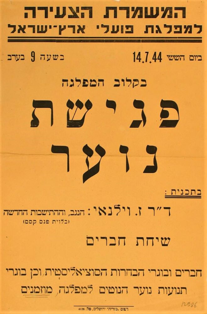 כרוז מטעם המשמרת הצעירה של מפלגת פועלי ארץ ישראל, המזמין בני נוער להרצאה בנושא הנגב וההתיישבות החדשה בהשתתפות ד"ר זאב וילנאי, יולי 1944. (KRU\12986)