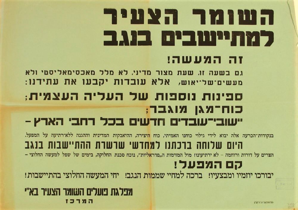 התנועה ביקשה להגביר את כוח המגן ולחזק את ההתיישבות העובדת: "ברכה למחיי שממות הנגב! יחי המעשה החלוצי בהתיישבות!" (KRU\7793)