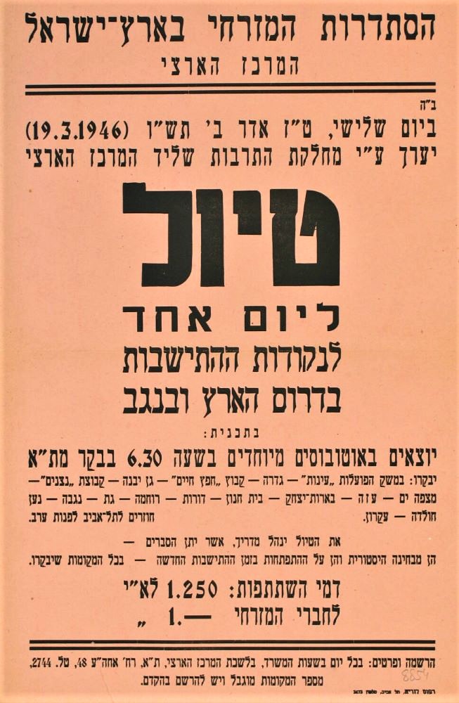 הזמנה לטיול לנקודות התיישבות בדרום ובנגב המערבי מטעם "הסתדרות המזרחי בארץ ישראל" בליווי הדרכה על ההיסטוריה של היישובים ועל ההתיישבות החדשה, כולל ביקור בעזה, בבארות יצחק, בבית חנון (ניר עם), בדורות וברוחמה, מרץ 1946. (KRU\8854)