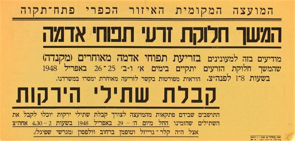 מודעה על חלוקת זרעי תפוחי אדמה מקנדה, אפריל 1948 (KRU\7961)