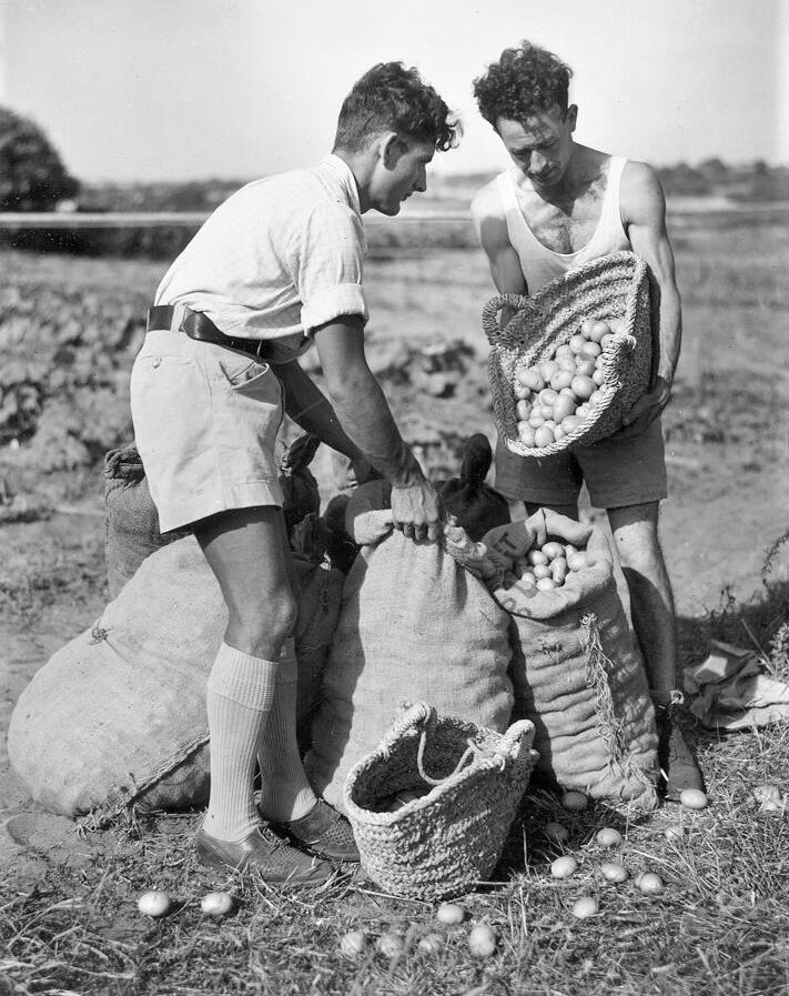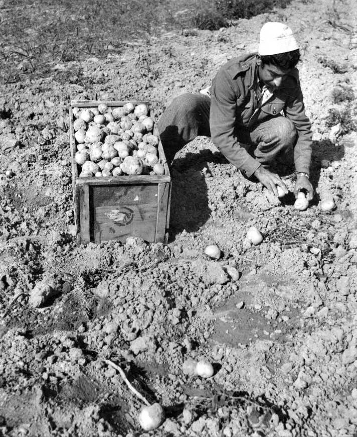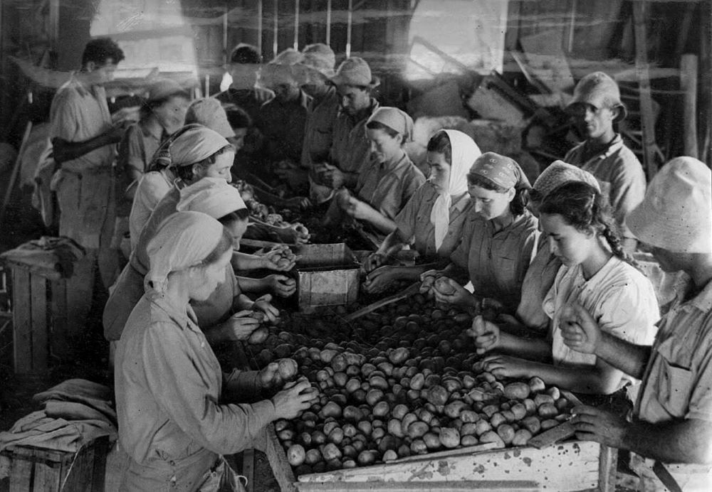 מיון תפוחי אדמה ידני בקיבוץ נגבה, 1943. צלם: זולטאן קלוגר, אוסף קרן