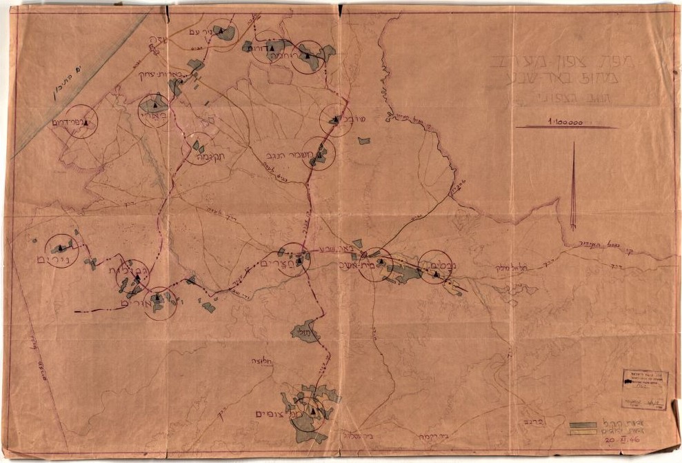 מניר-עם עד תל צופים (קיבוץ רביבים) עם סימון תוואי קווי צינורות המים לנגב, 1946.