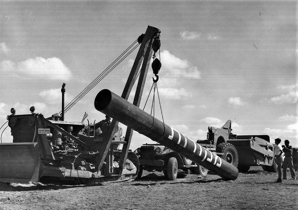 הצינורות, ששימשו להובלת המים מקידוח ניר-עם, מונחים על הצינור החדש, 17.6.1951.