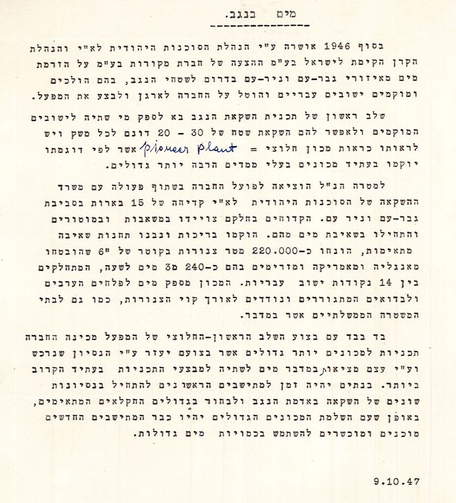סידור אספקת המים ליישובי הנגב והכשרת המתיישבים בניר-עם בשימוש המכונות, 1947. (PHG\1009407)
