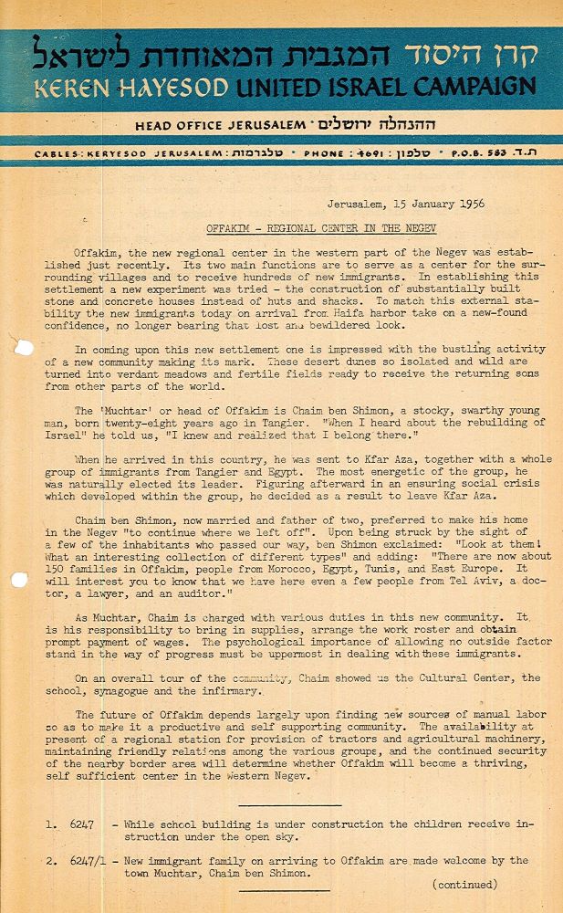 אופקים, שנלוותה לתצלומי קרן היסוד מטעם שירות התמונות, 15.1.1956 (KH4\12771)