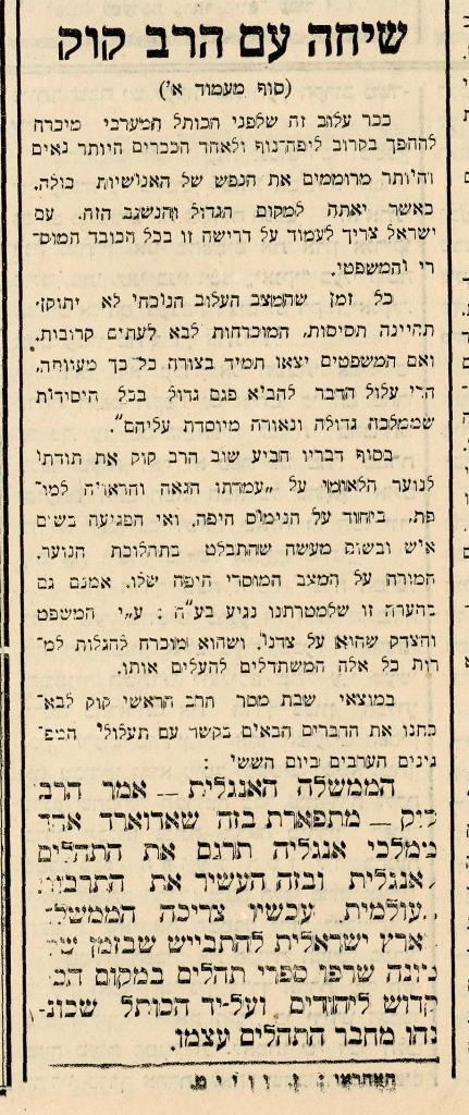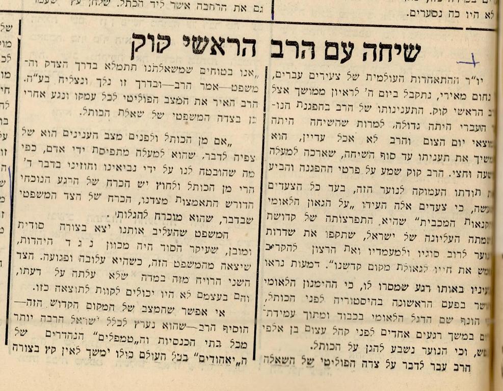 העיתון "דאר היום" ערך ראיון עם הרב קוק במוצאי הצום, בו הוא הביע את התרגשותו ממסירותו של הנוער היהודי לכותל ומגאוותו הלאומית. הוא אף קרא לשלטון הבריטי לאפשר ליהודים להגיע לכותל בחופשיות ולפעול לכך שהמקום ישופץ.